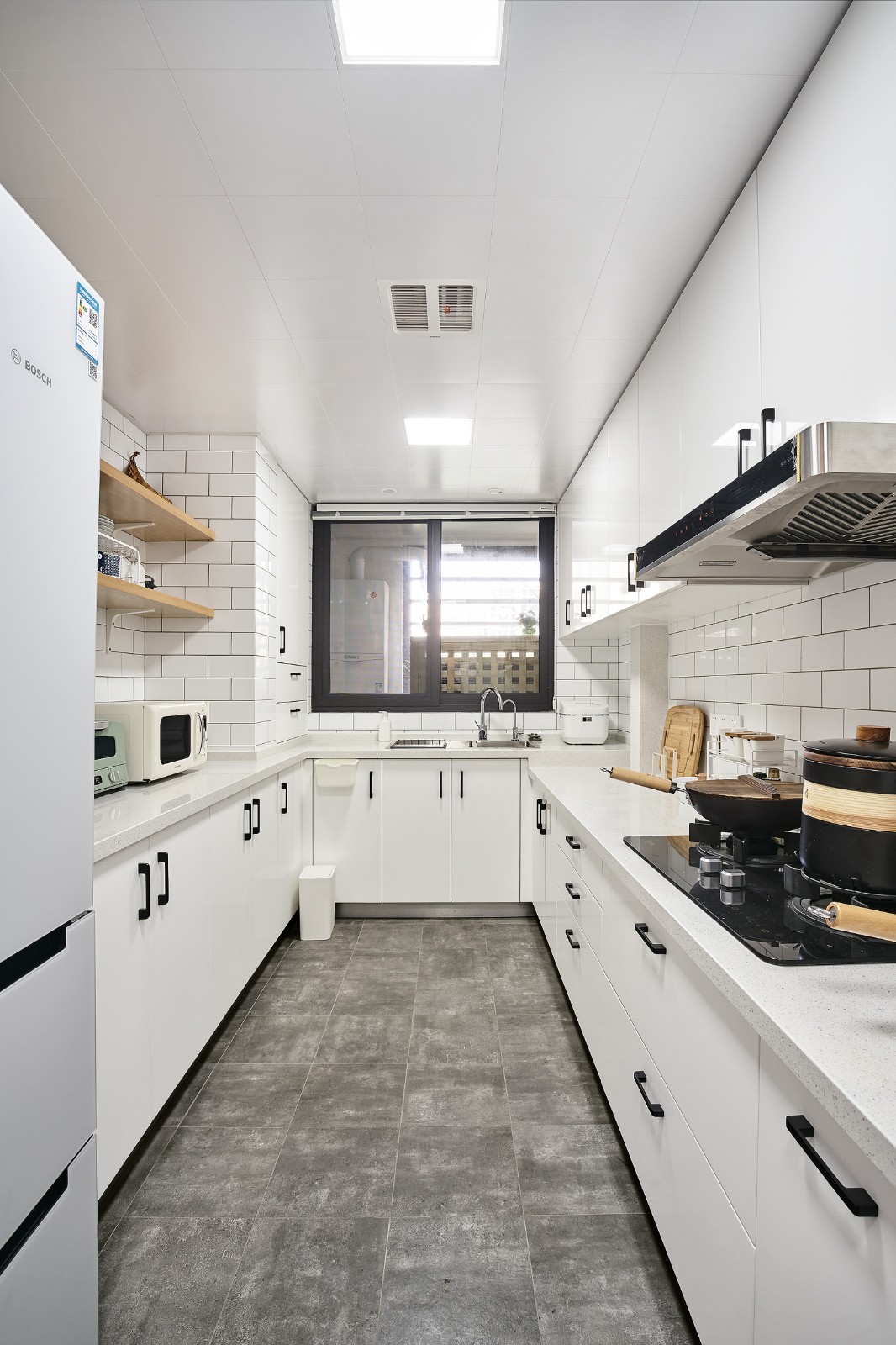 小白磚錯落,黑色櫥柜把手十分精致。