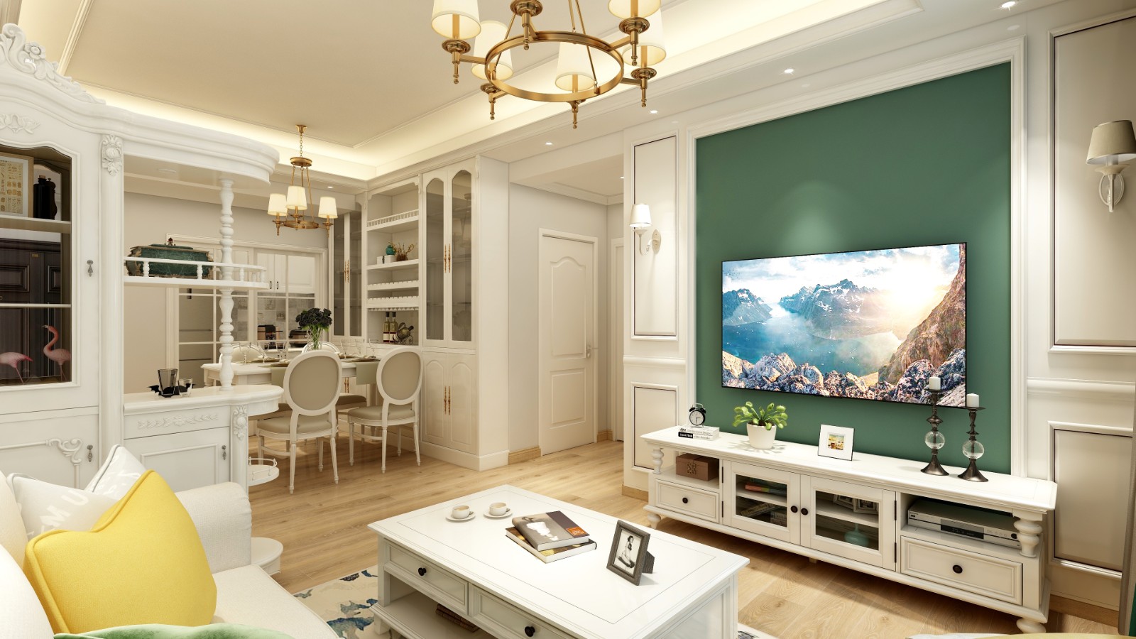 電視背景墻以簡(jiǎn)潔干練的石膏線打造,讓空間層次更加豐滿(mǎn),輔以?xún)杀K時(shí)尚壁燈,營(yíng)造精致優(yōu)雅的氛圍。