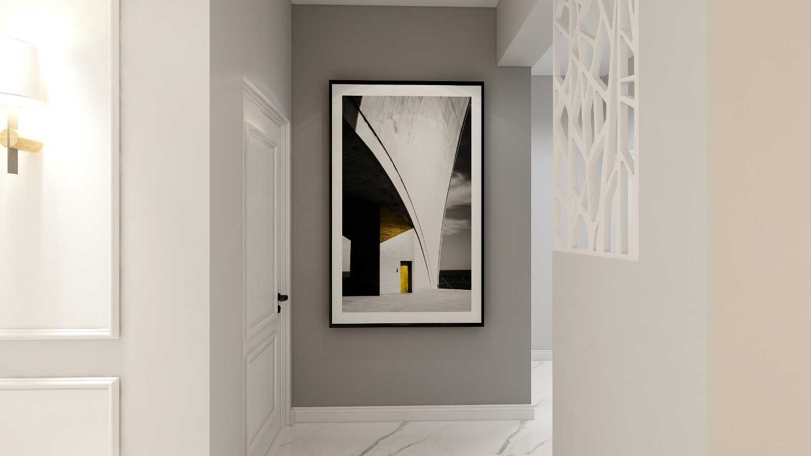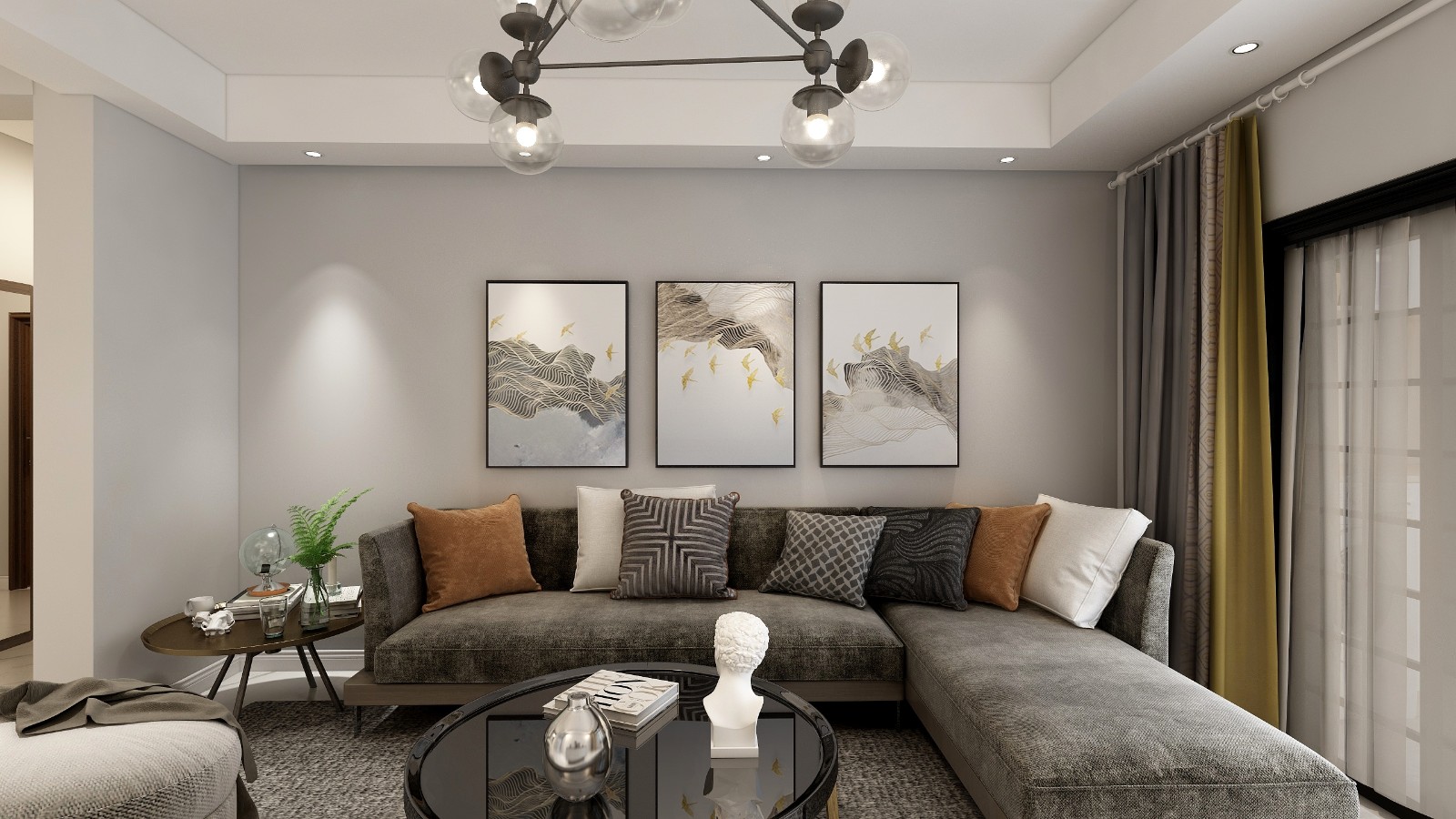 淺灰色的背景墻面漆,時(shí)尚動(dòng)感的簡(jiǎn)約風(fēng)掛畫,十分具有現(xiàn)代風(fēng)。一絲工業(yè)元素的棕灰色沙發(fā)搭配黑色的茶幾,深灰色加入一抹亮色黃,使空間的流行元素渲染出來。